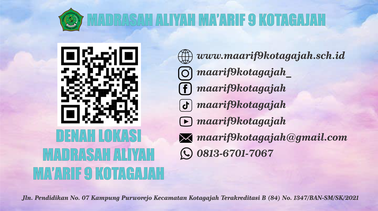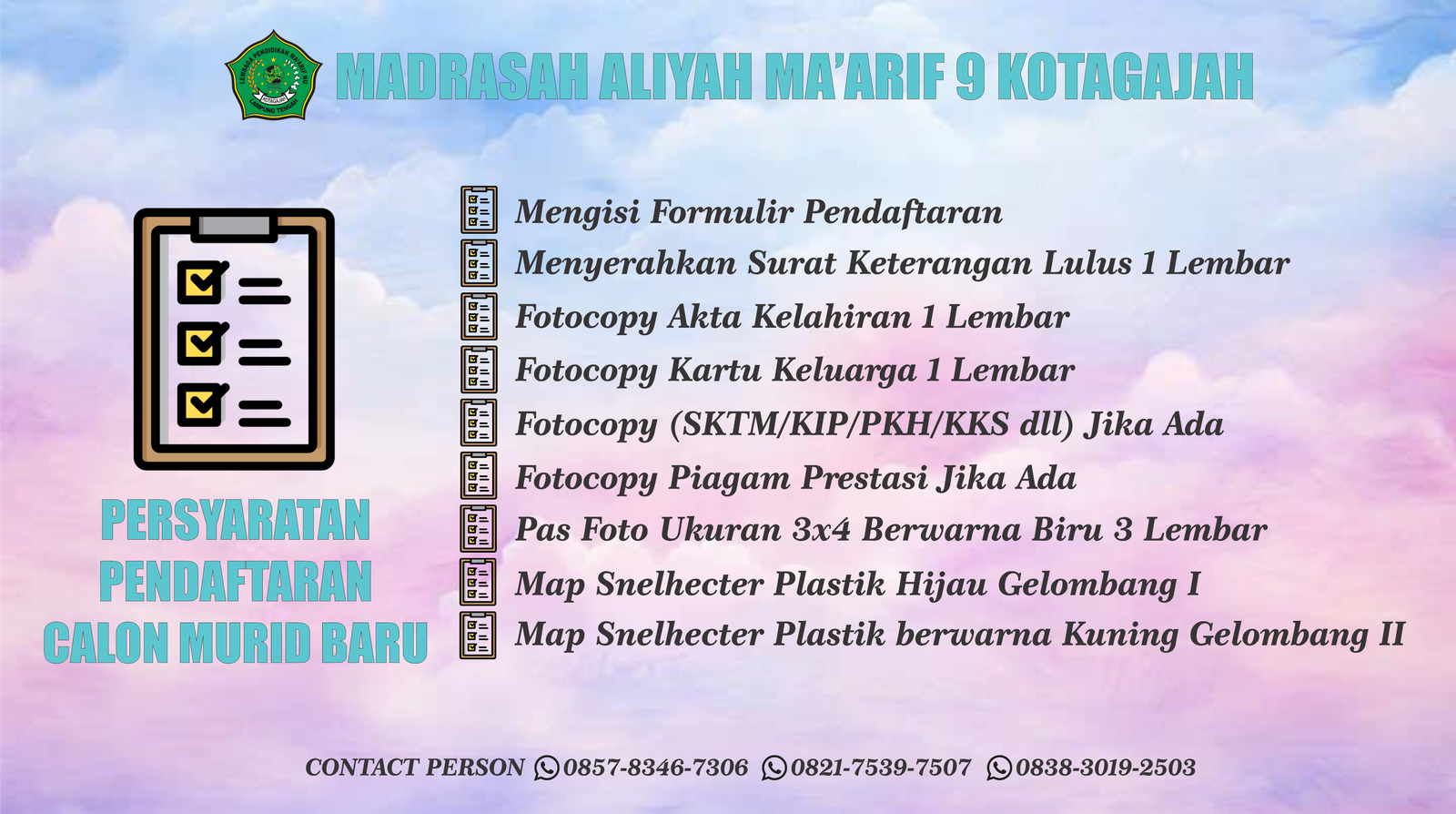 MA. MA'ARIF 9 KOTAGAJAH Dalam rangka memudahkan proses Sistem Penerimaan Murid Baru (SPMB), menyediakan layanan SPMB secara online. Dengan adanya sistem ini, proses pendaftaran dapat berlangsung lebih cepat serta dapat diakses dari mana saja dan kapan saja selama masa SPMB Online dibuka. Calon murid tidak perlu datang langsung ke madrasah untuk melakukan pendaftaran awal cukup mengakses website SPMB Online MA. MA'ARIF 9 KOTAGAJAH.